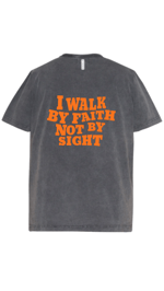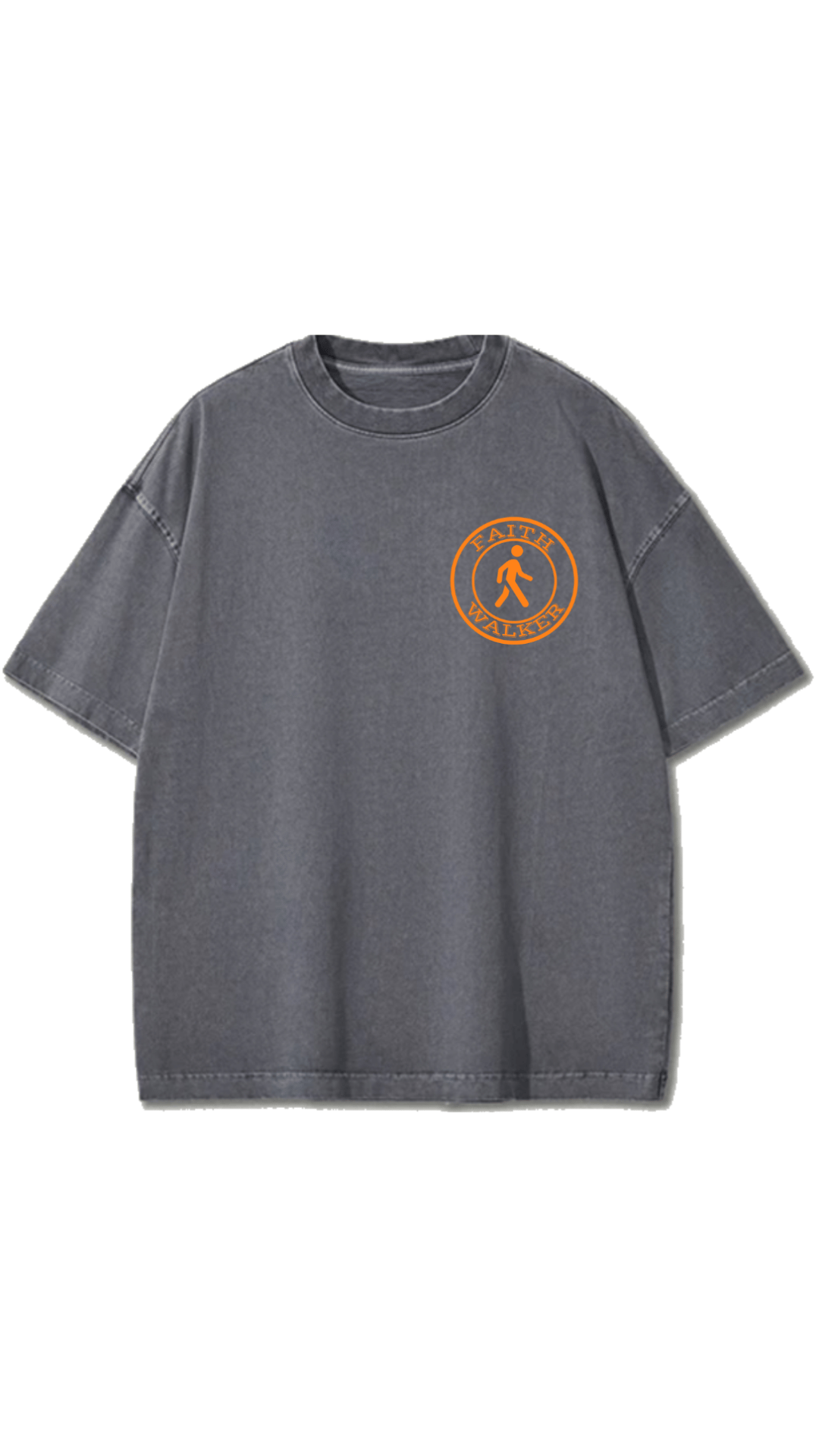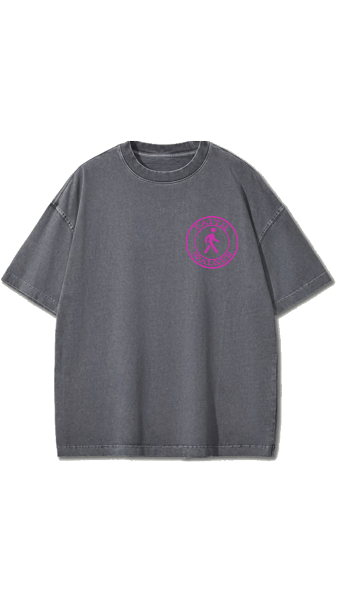 The Faith Walker tee, is an Ash Gray Oversized Fit t-shirt with typography on the front and back in Electric Orange and Fusion Pink. “Faith Walker” is written on the front left chest of the t-shirt and boldly on the back is the statement “I Walk By Faith Not By Sight.” 2 Corinthians 5:7, reminds us that we are to walk by faith and not by sight, standing strong and confident in the Lord which was our total thought process behind the design of the Faith Walker Tee. To simply, boldly affirm this scripture and make it a statement!
